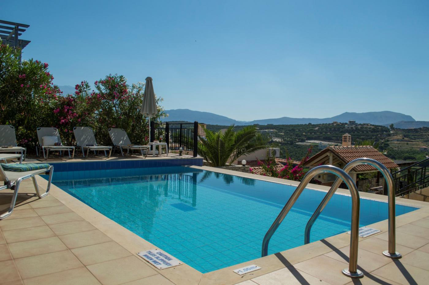 The outside spaces at this villa are outstanding. There is a large paved sitting/sunbathing area with space for sun loungers and umbrellas immediately in front of the lounge area. A few steps down leads to the swimming pool with surrounding sunbathing terraces and the well tended, landscaped garden which adds vibrant colour for everyone to enjoy.
