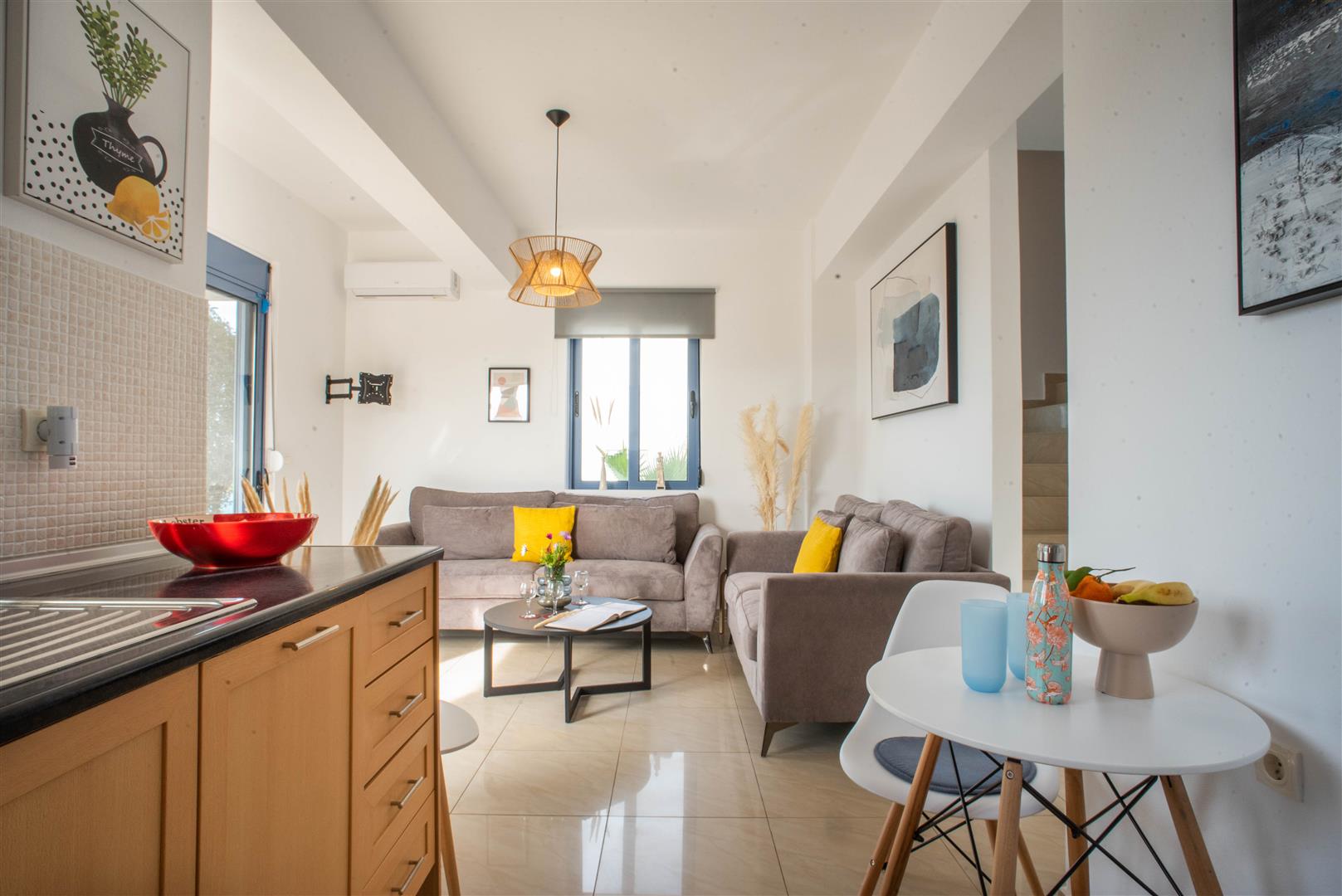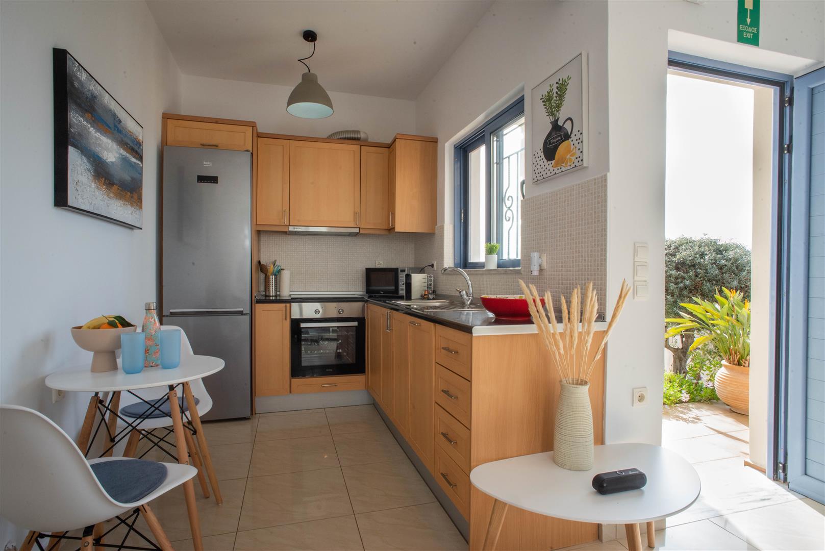 You enter the villa into the light and airy open plan lounge and kitchen/dining area which is comprehensively equipped for all your self-catering needs (see amenities list below). A small table and chairs together with comfortable sofas provide ample seating for 6 people.