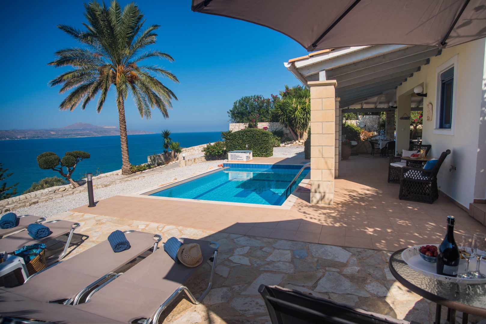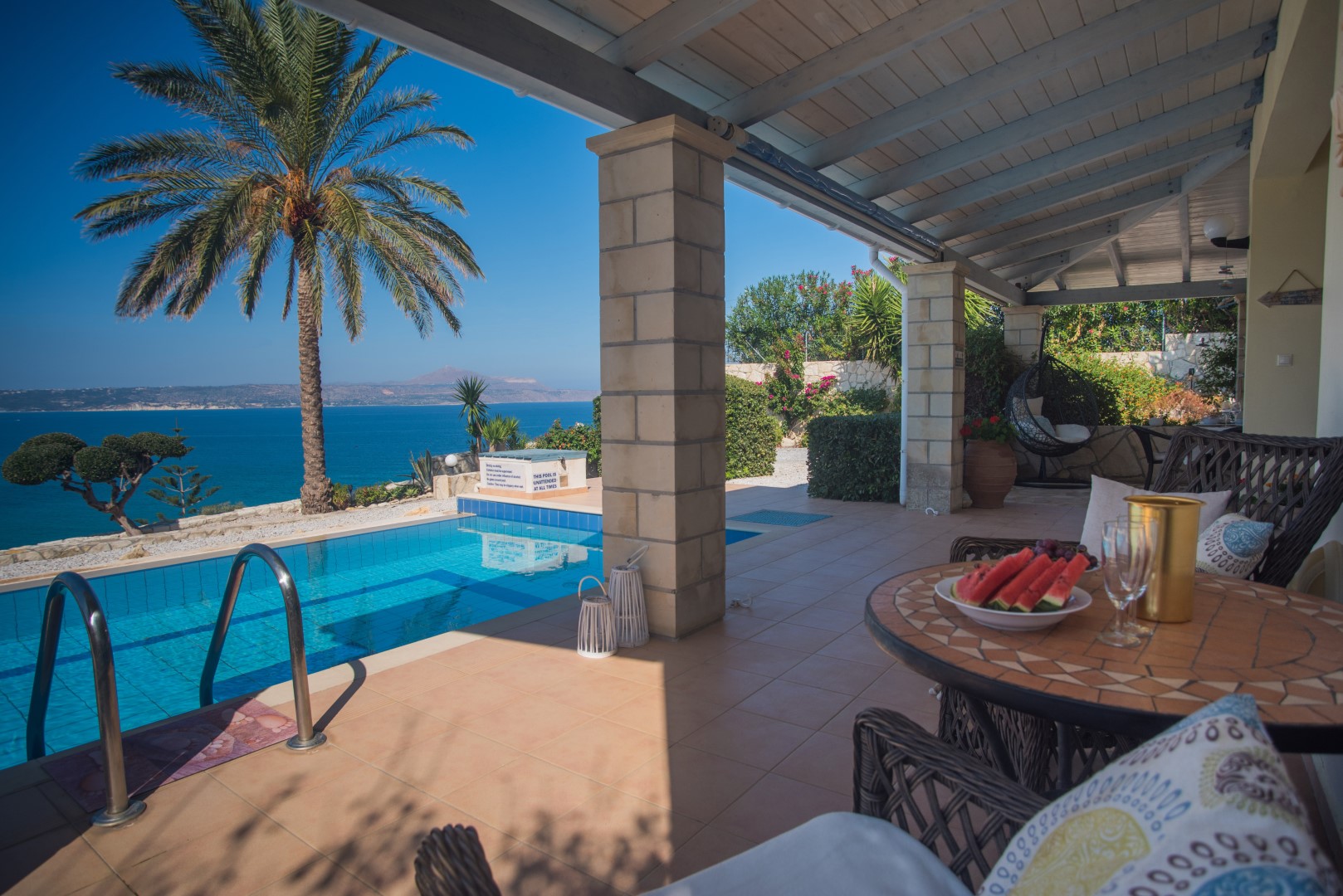 The outside spaces at this villa are outstanding. The villa is set in a beautiful position right opposite the small beach of Kera with awesome sea views across Souda Bay. The area immediately around the villa has been paved to provide a large sitting /dining/ sunbathing area. There is plenty to suit everyone with both sunny and shady spaces and lots of tables and chairs. The purpose built BBQ area with granite work surfaces, is situated at the back of the garden where it has its own covered dining area. The cocoon swing chair will be a popular spot for relaxing. The mosaic tiled pool is set into the front terrace area and is surrounded by sun loungers and umbrellas. If you tire of the pool, the little sand and pebble beach at Kera is just across the road (and down a track).