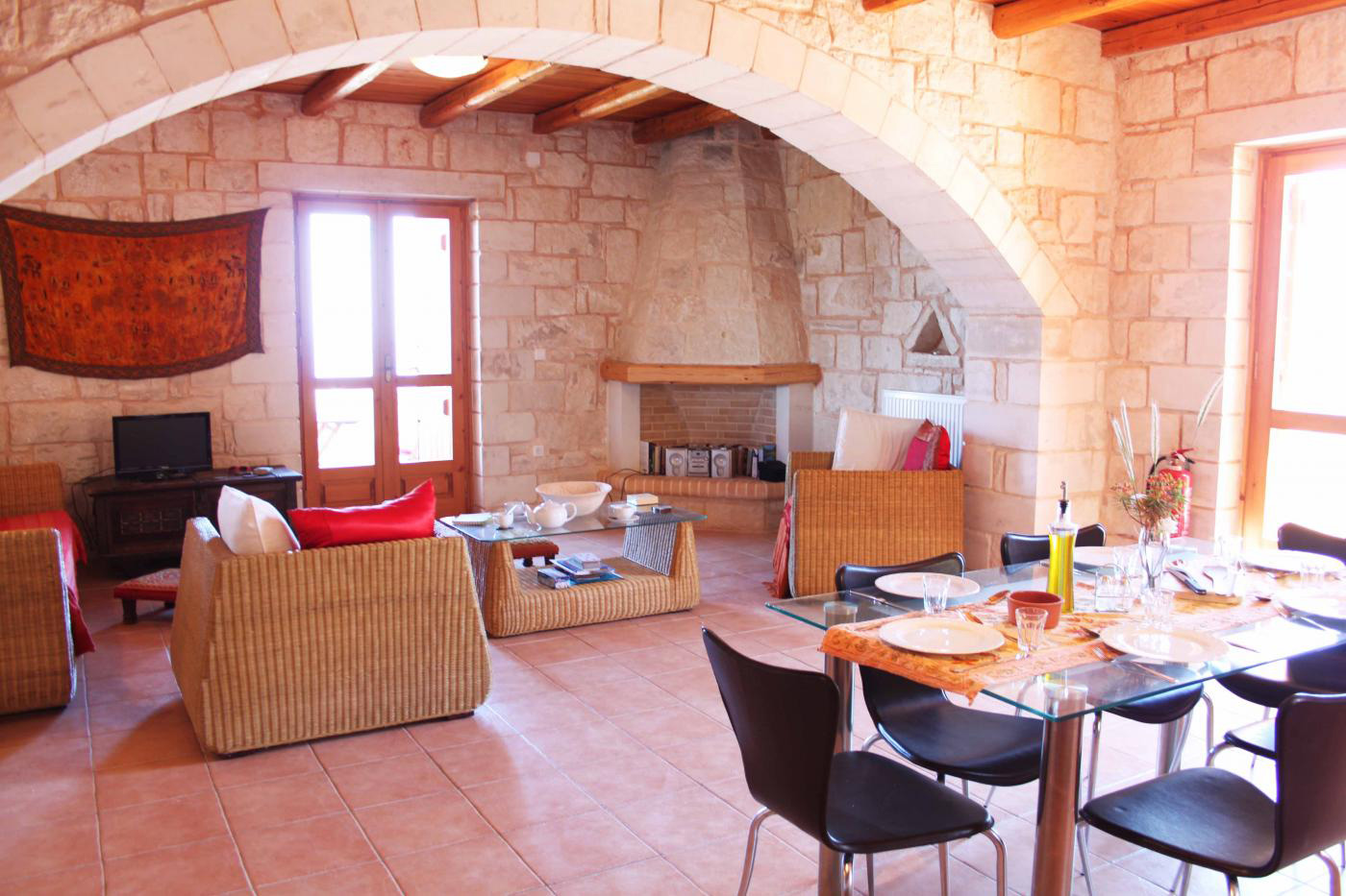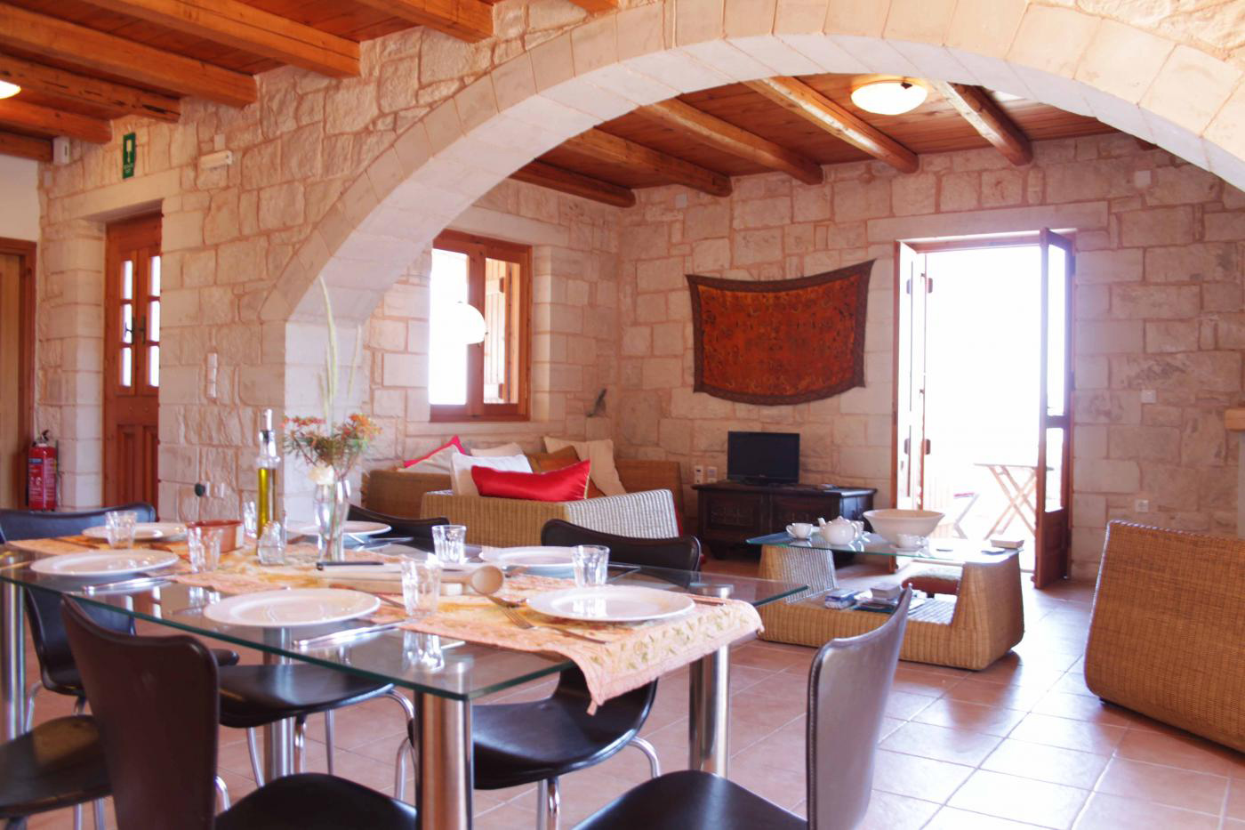 The ground floor consists of a comprehensively fitted kitchen, dining area and lounge which is all open plan. Stone features internally include an impressive arch separating the kitchen and sitting areas and a fireplace which is the focal point of the lounge area. Wooden french doors open up off the lounge to two balconies with views. The lounge is comfortably furnished with rattan furniture and for entertainment there is a TV (Smart) and bluetooth speaker. A selection of books are provided at the villa.