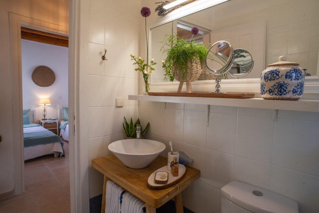 On the first floor, you’ll find the second bath/shower room, as well as the washing machine. The two air-conditioned bedrooms each provide a peaceful retreat. The first is a double room with a wardrobe, bedside tables, and a chest of drawers, while the second is a twin room with similar storage. Both bedrooms open onto the top terrace, where you can enjoy stunning views of Rethymnon Bay, especially as the evening lights come on across the water. This private terrace is perfect for relaxing with a cool drink while watching buzzards soar over the hills.