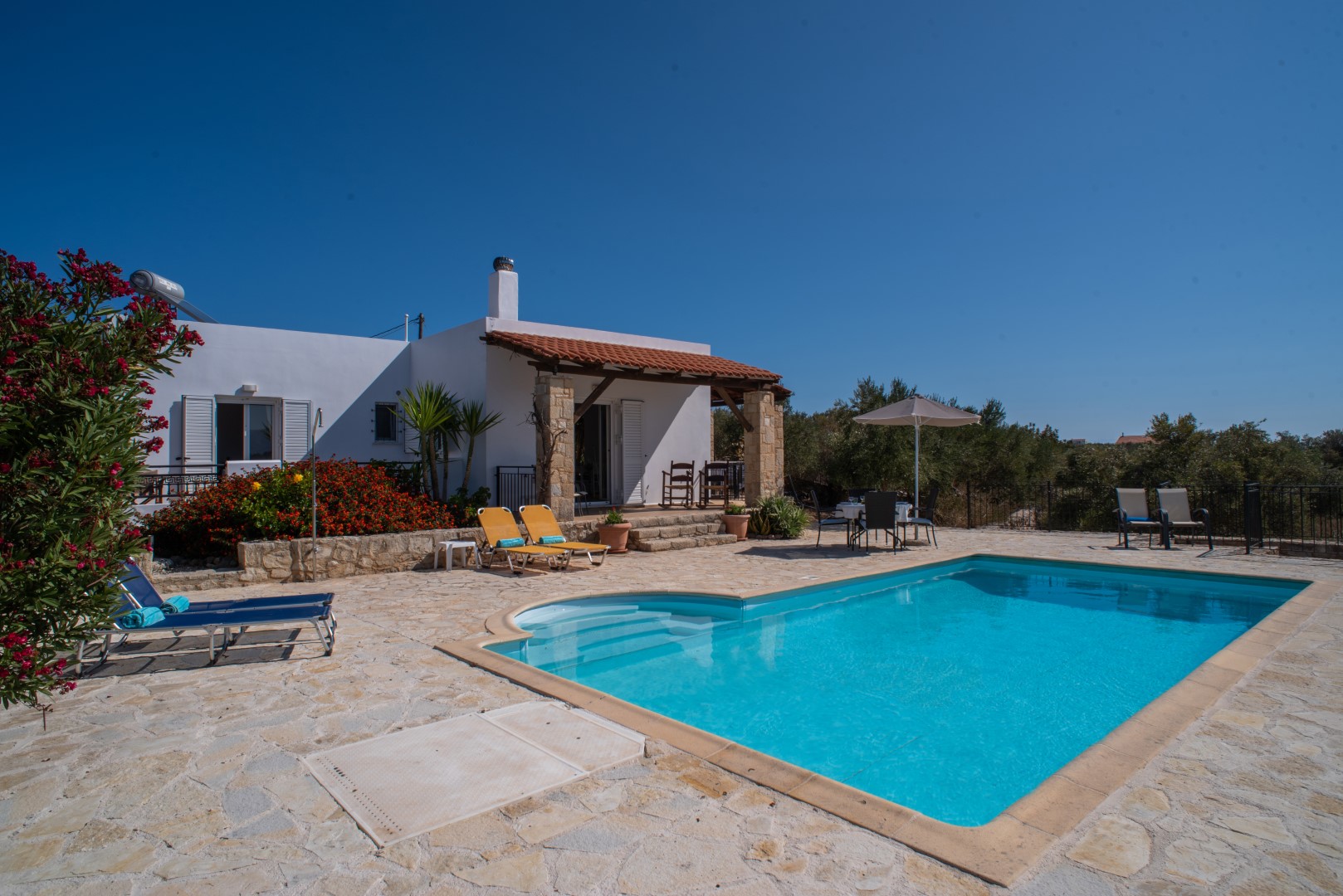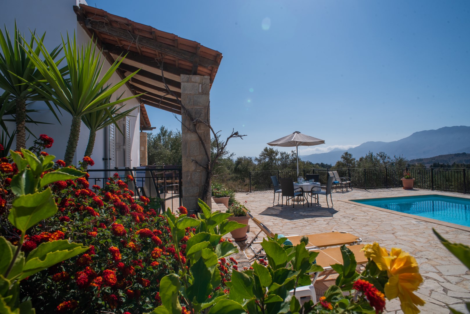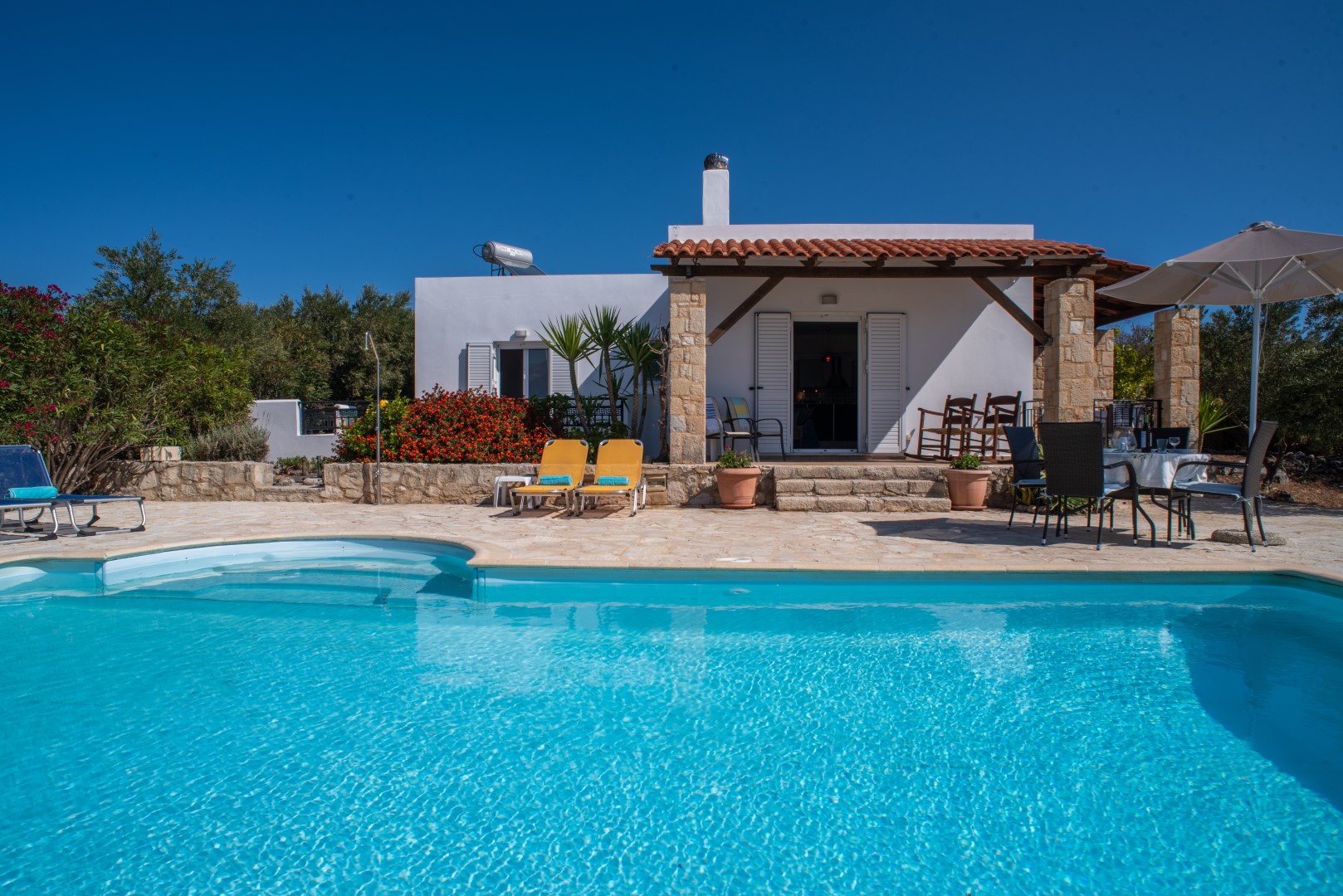 Adjacent to the pool area, again with easy access to the lounge area, is another covered terrace with 2 rocking chairs and other occasional furniture; perfect for chilling out with views across the sparkling pool to the vast open countryside and White Mountains. Furthermore the spacious poolside terrace is extremely private, situated above the olive grove with no very near neighbours, it is equipped with 6 sunloungers, an umbrella and a circular table and 4 chairs; perfect for al fresco dining at any time of day.
