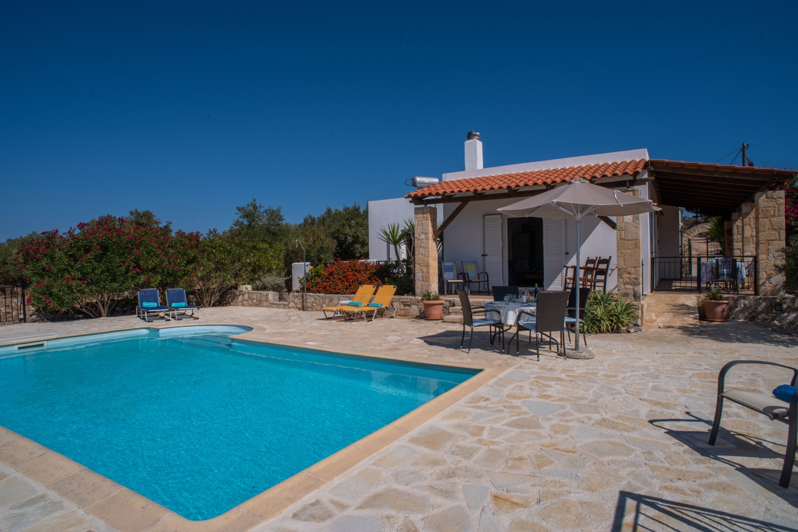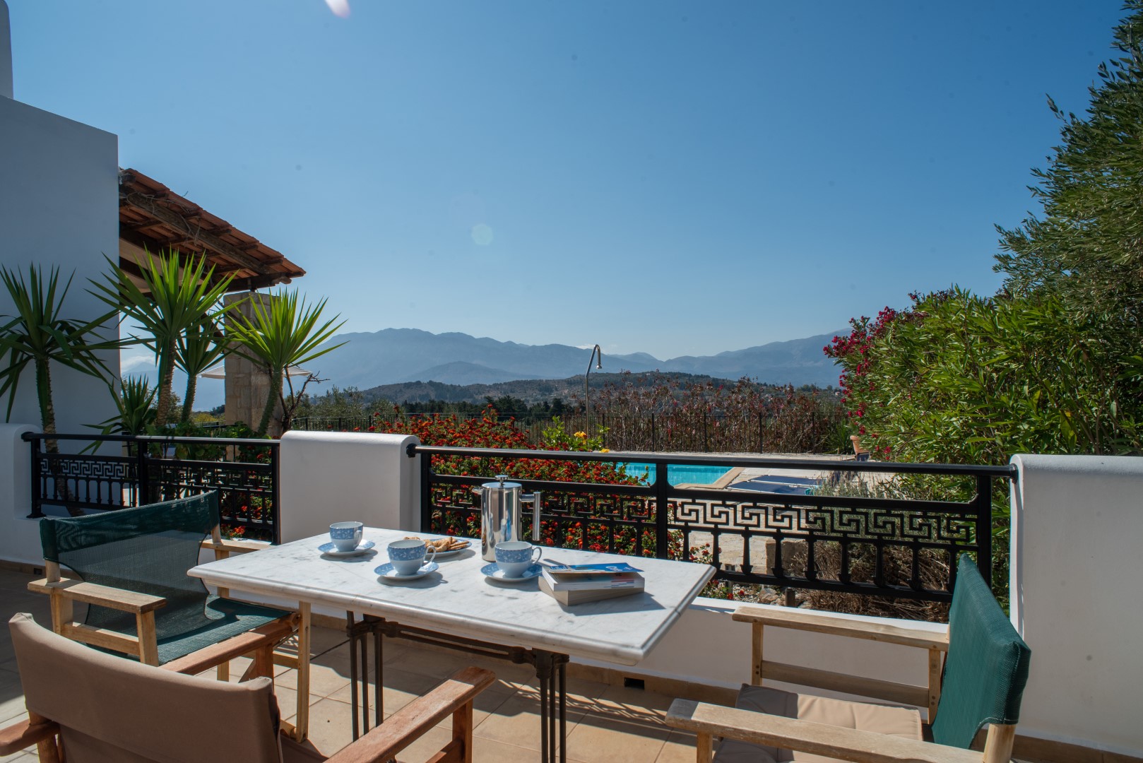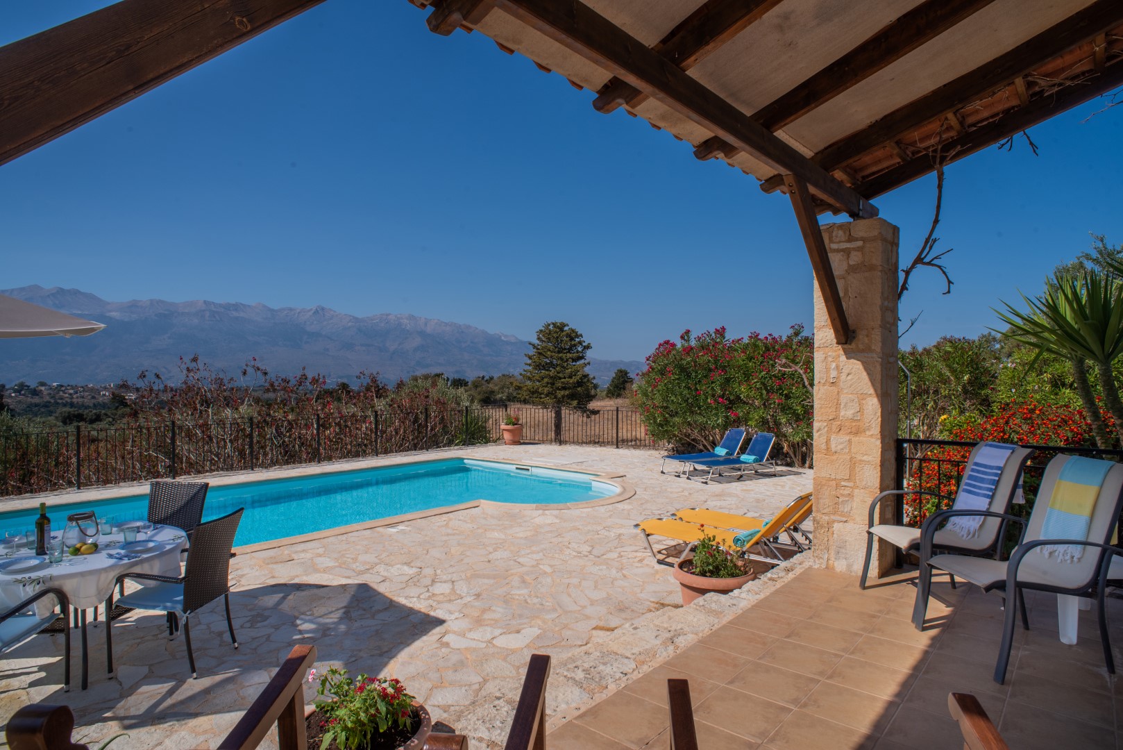 Adjacent to the pool area, again with easy access to the lounge area, is another covered terrace with 2 rocking chairs and other occasional furniture; perfect for chilling out with views across the sparkling pool to the vast open countryside and White Mountains. Furthermore the spacious poolside terrace is extremely private, situated above the olive grove with no very near neighbours, it is equipped with 6 sunloungers, an umbrella and a circular table and 4 chairs; perfect for al fresco dining at any time of day.