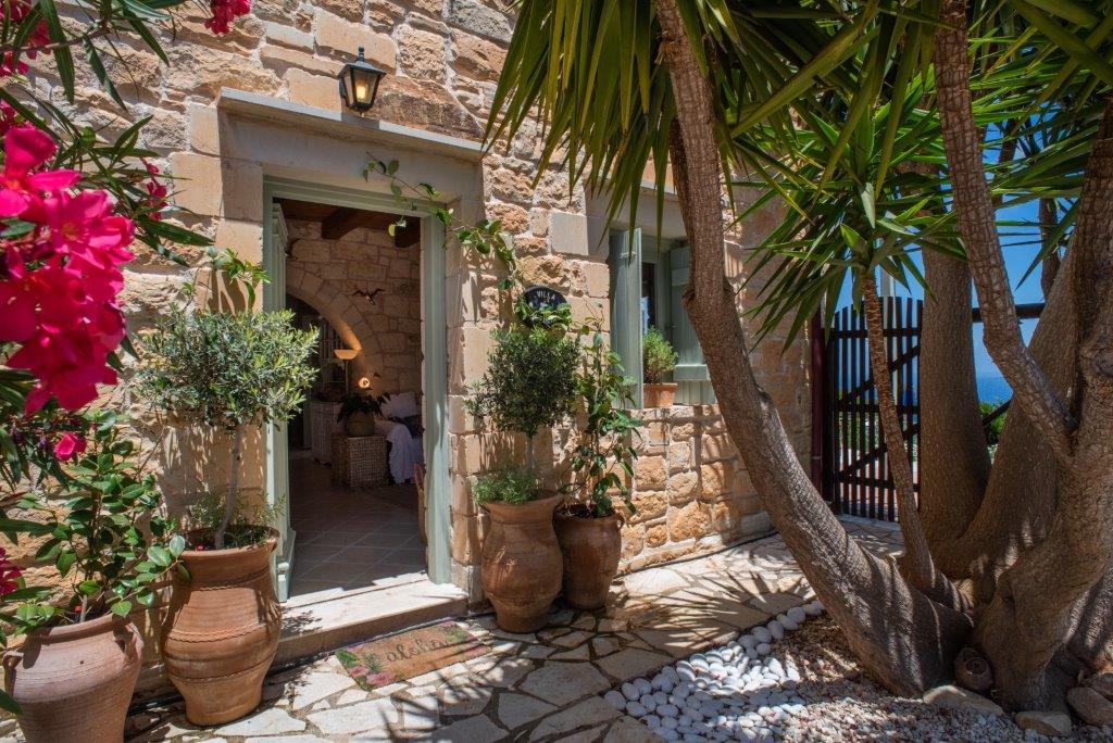 Built with light honey-colored stone, Villa Antheia blends traditional style with modern comforts. The villa’s wooden shutters and traditional wooden ceilings on the ground floor add to its rustic charm. The ground floor is equipped with electric fans to keep you cool, while the upstairs bedrooms are air-conditioned for your comfort.