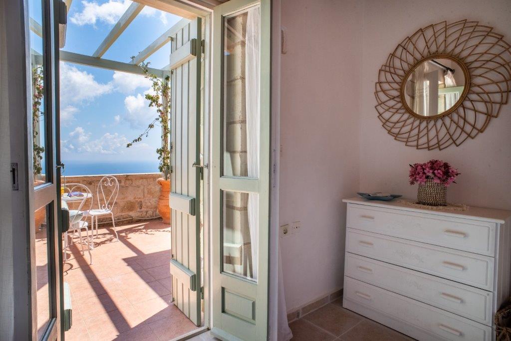 On the first floor, you’ll find the second bath/shower room, as well as the washing machine. The two air-conditioned bedrooms each provide a peaceful retreat. The first is a double room with a wardrobe, bedside tables, and a chest of drawers, while the second is a twin room with similar storage. Both bedrooms open onto the top terrace, where you can enjoy stunning views of Rethymnon Bay, especially as the evening lights come on across the water. This private terrace is perfect for relaxing with a cool drink while watching buzzards soar over the hills.